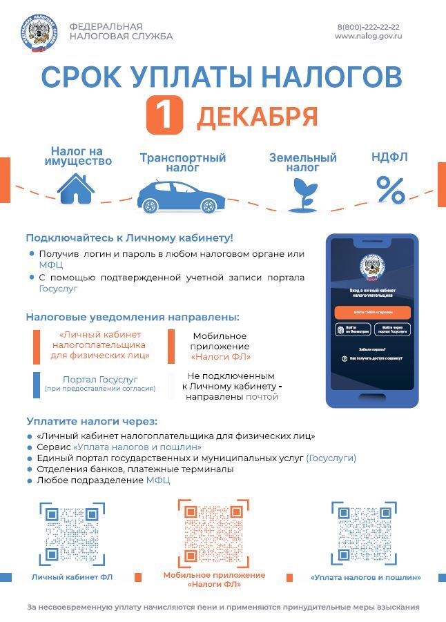 В ближайшее время гражданам, имеющим в собственности жилые дома, квартиры, транспортные средства, земельные участки, будут направлены налоговые уведомления на уплату имущественных налогов, а также НДФЛ за 2024 год. Срок уплаты налогов – не позднее 1 декабря 2025 года включительно. Если не уплатить налог вовремя, со 2 декабря будут начисляться пени.